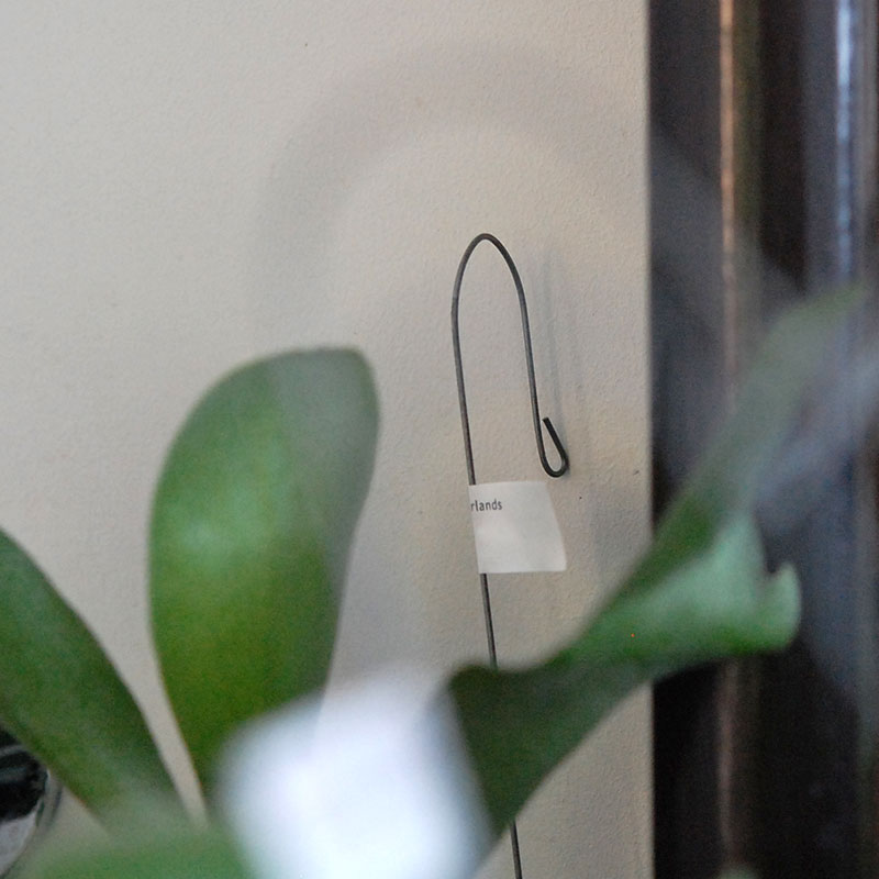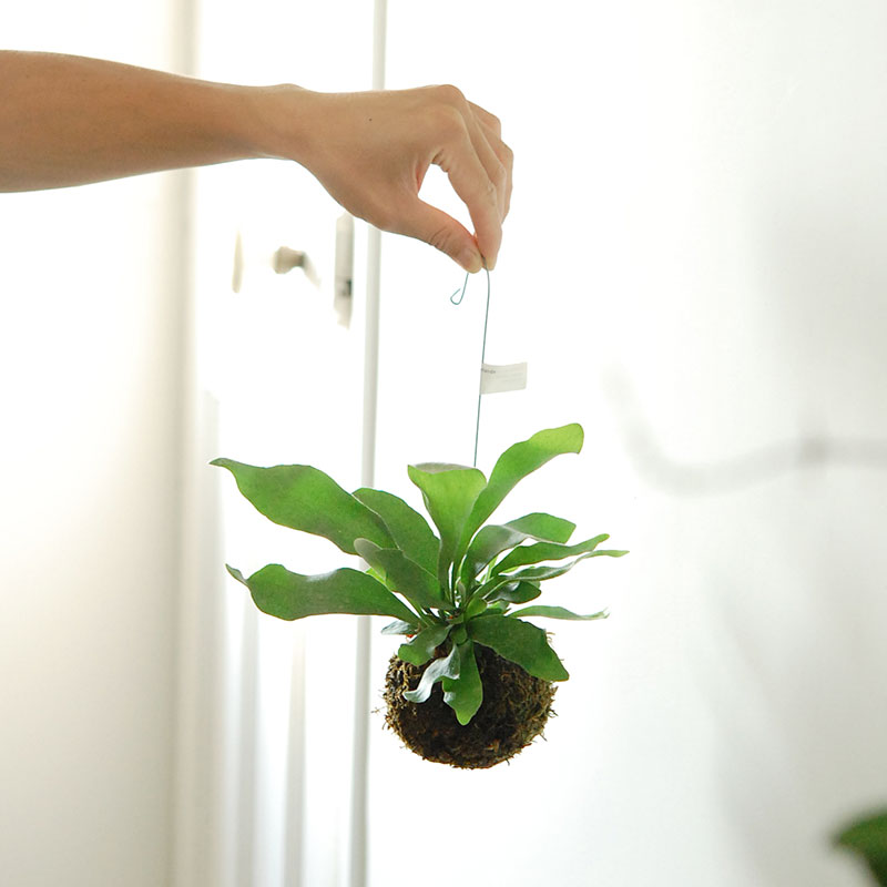 小さな苔玉タイプ。鉄のフックが付いていて、どこかにさっとかけられるので便利です。大きくなると、葉で覆われていくので、成長がとっても楽しみ!