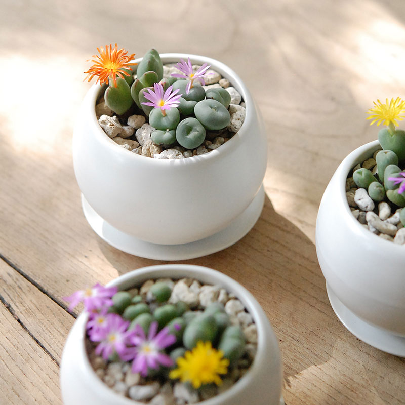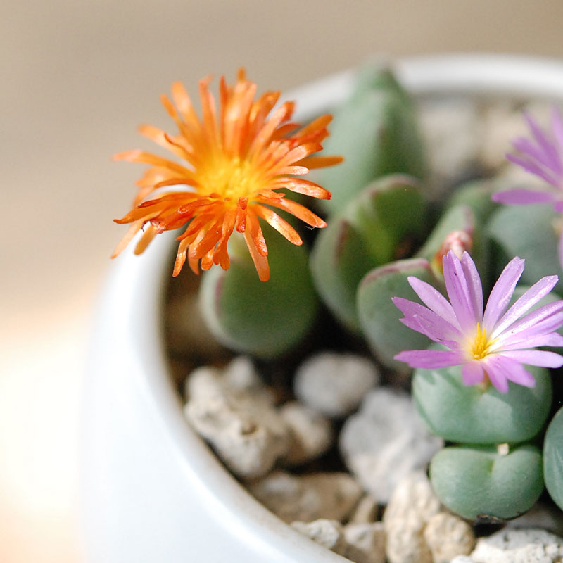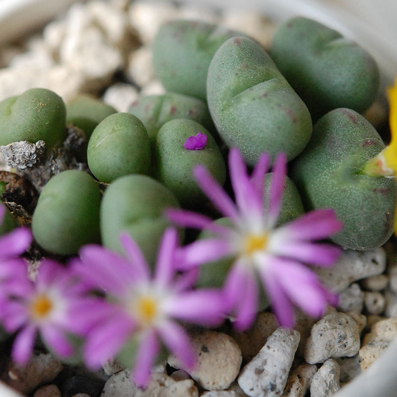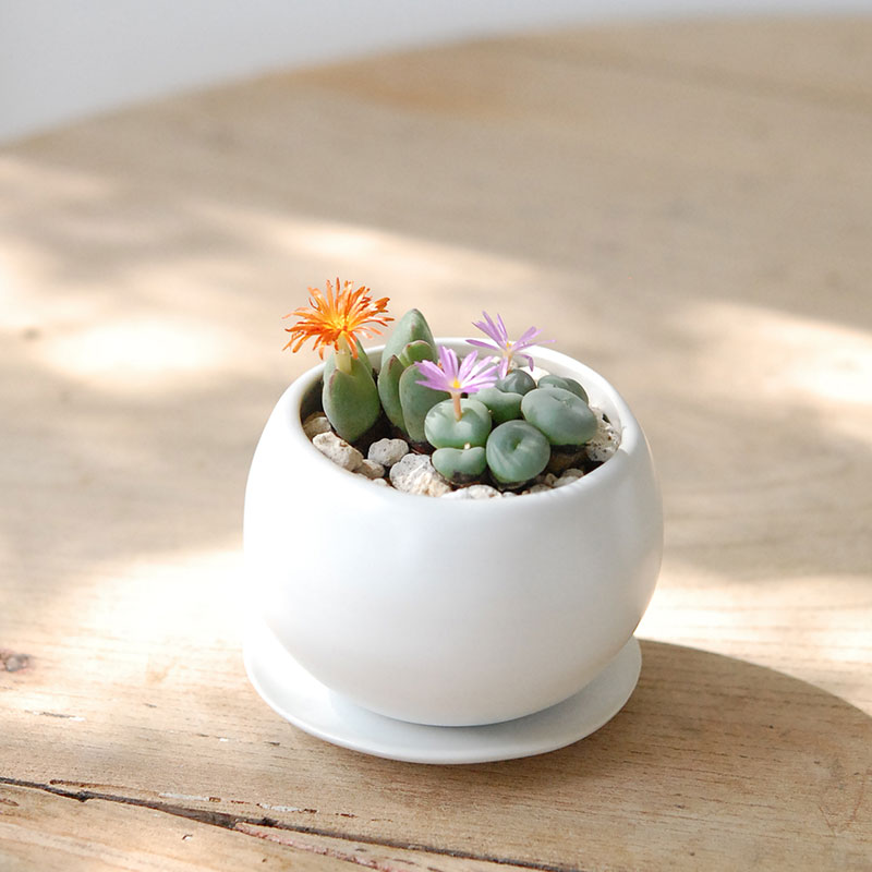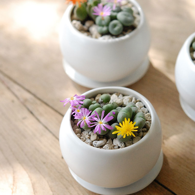 花が可愛く砂利の様な丸っこい形やハートの形をしたコノフィツム2種の寄せ植えです。