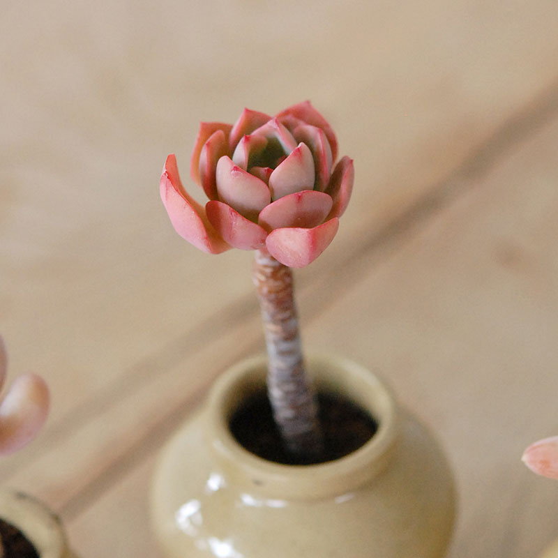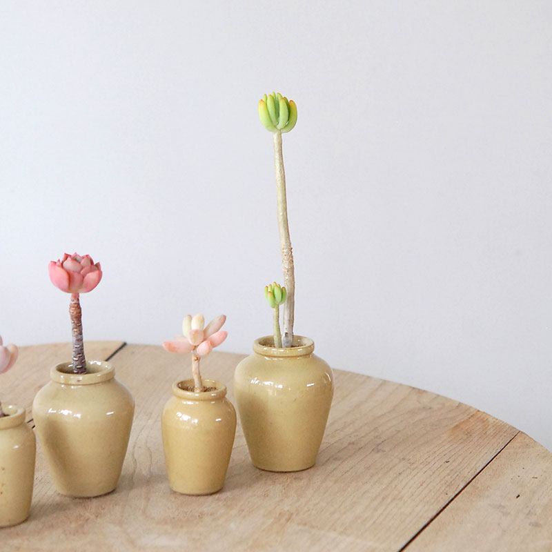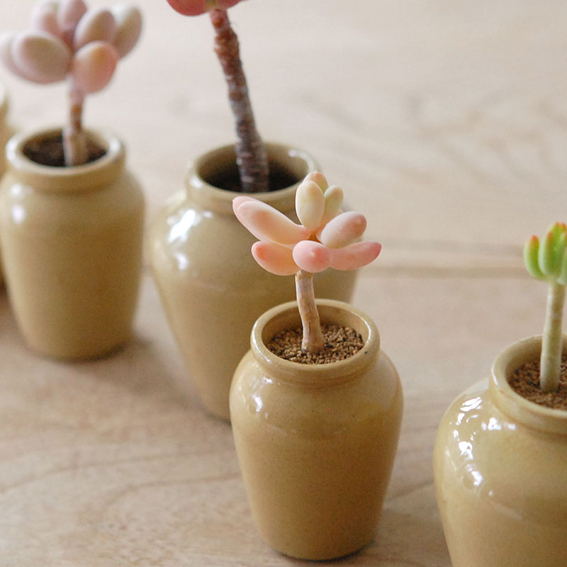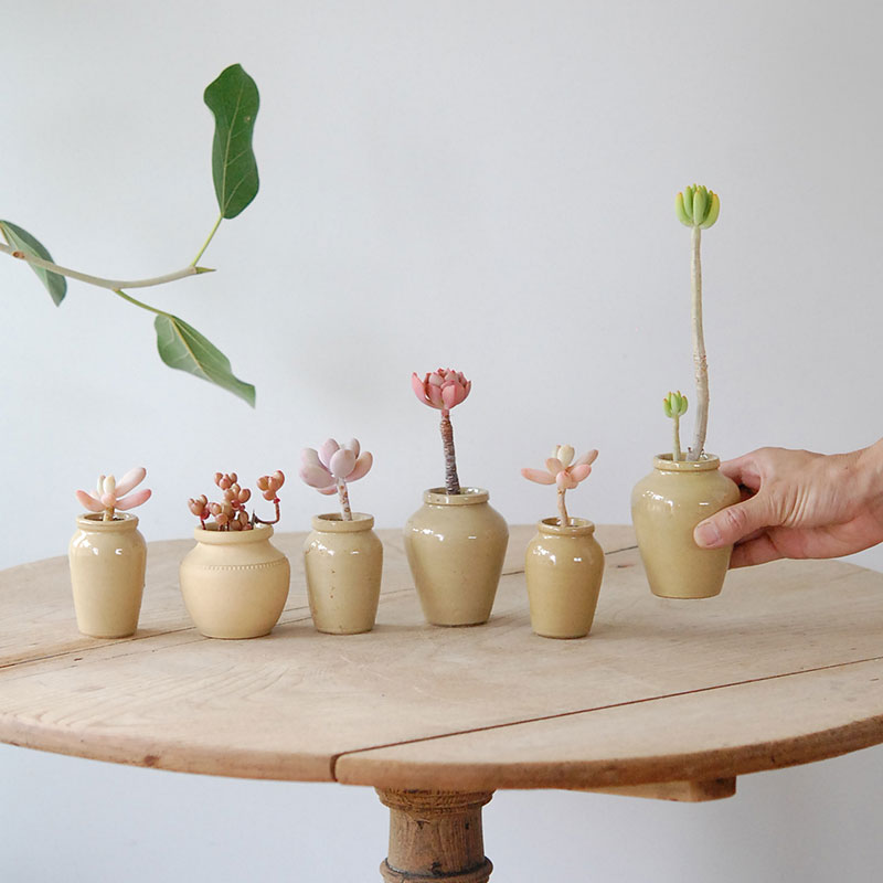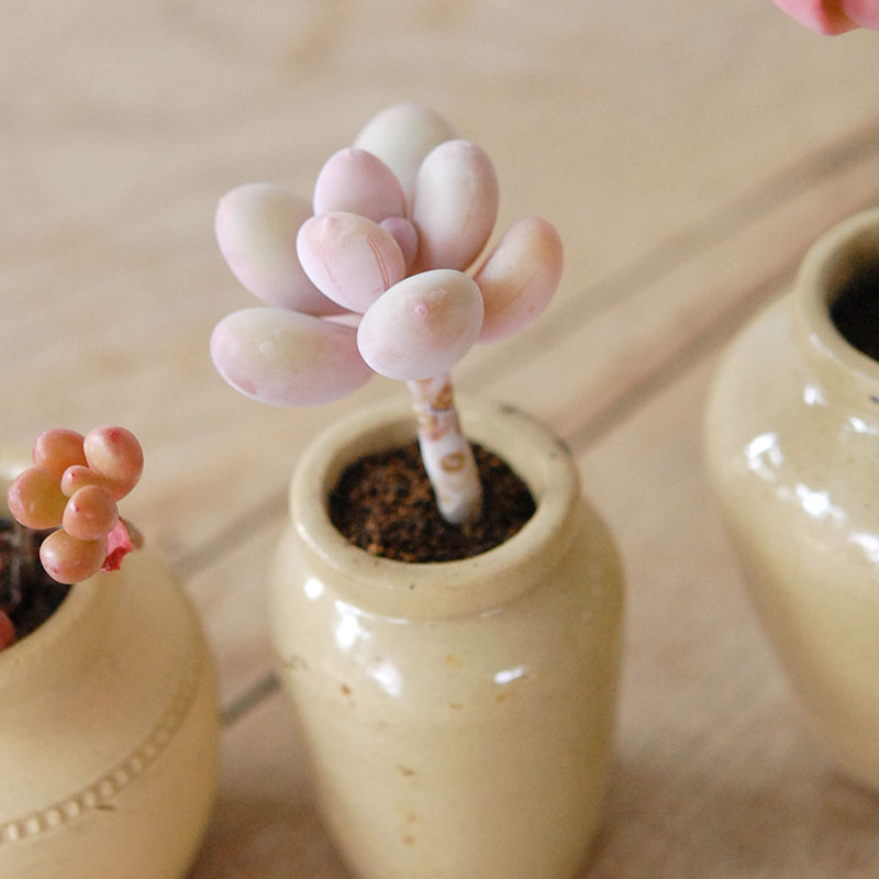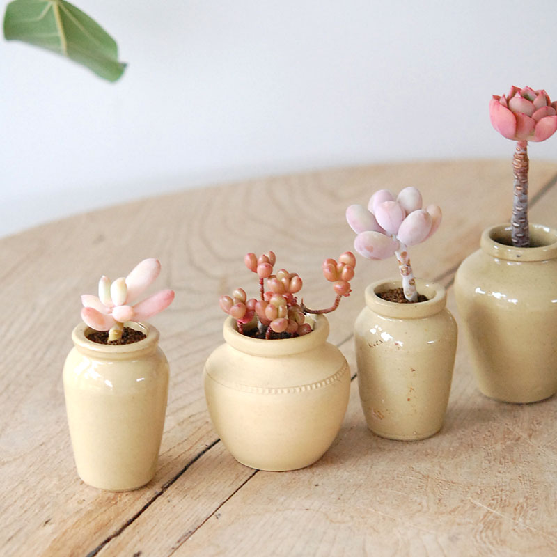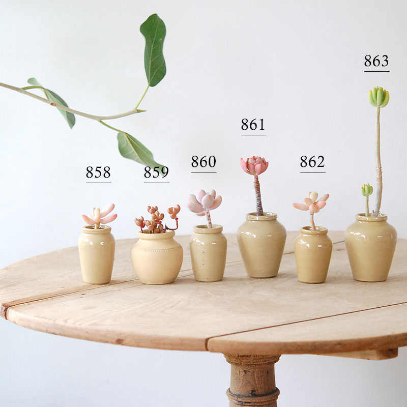 このタイプのビンテージポットは形のバランスがとても綺麗で大好きなのですが、数が少なくてレアな器です。贅沢に可愛らしい色々な多肉植物と合わせました。