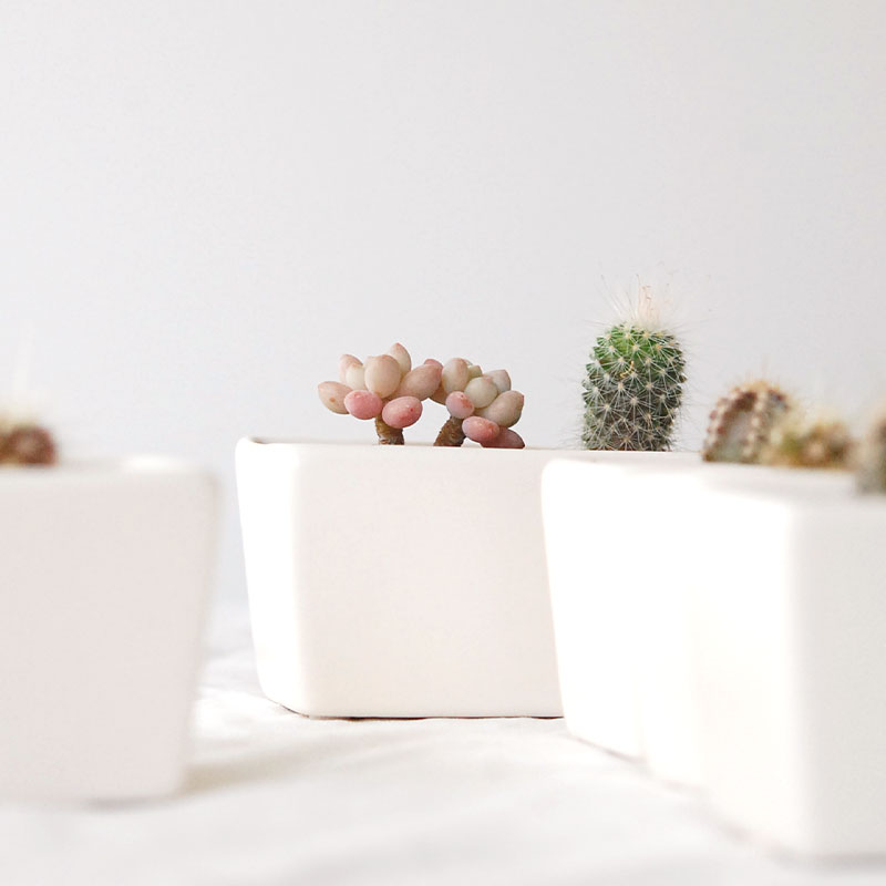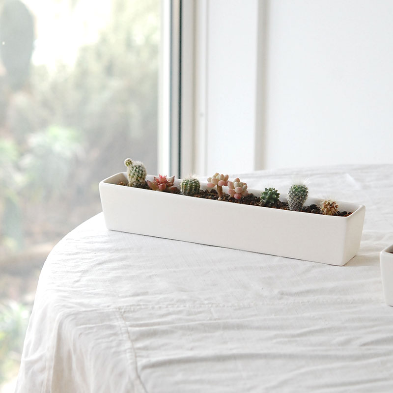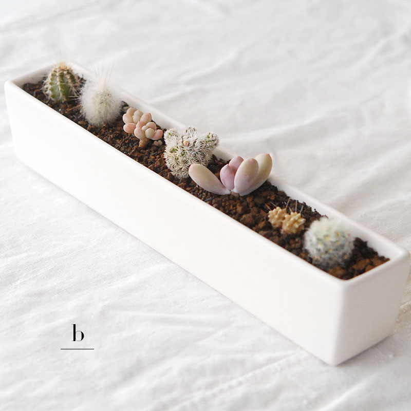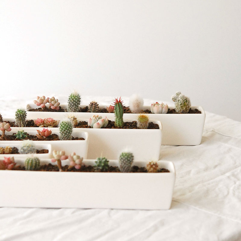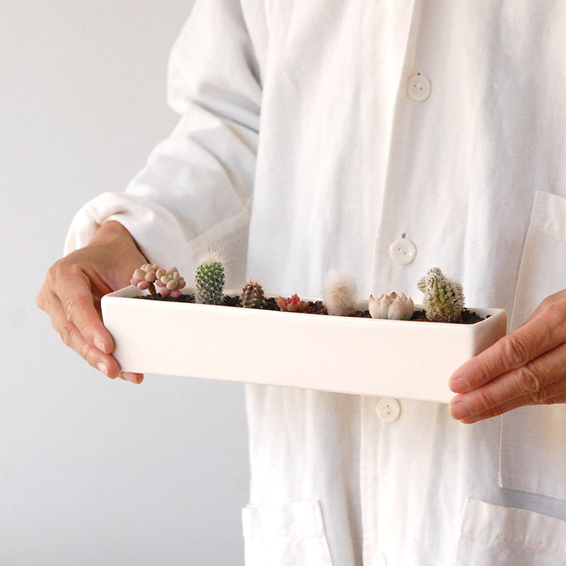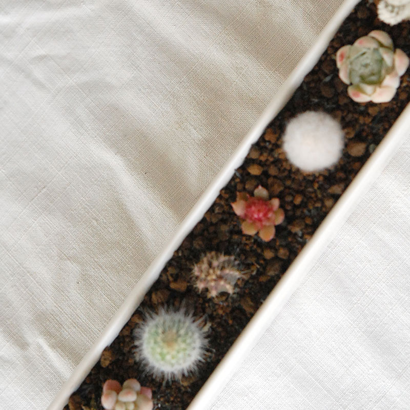 陶器の横長のコンテナーに小さなサボテンや多肉を並べて植え込みました。