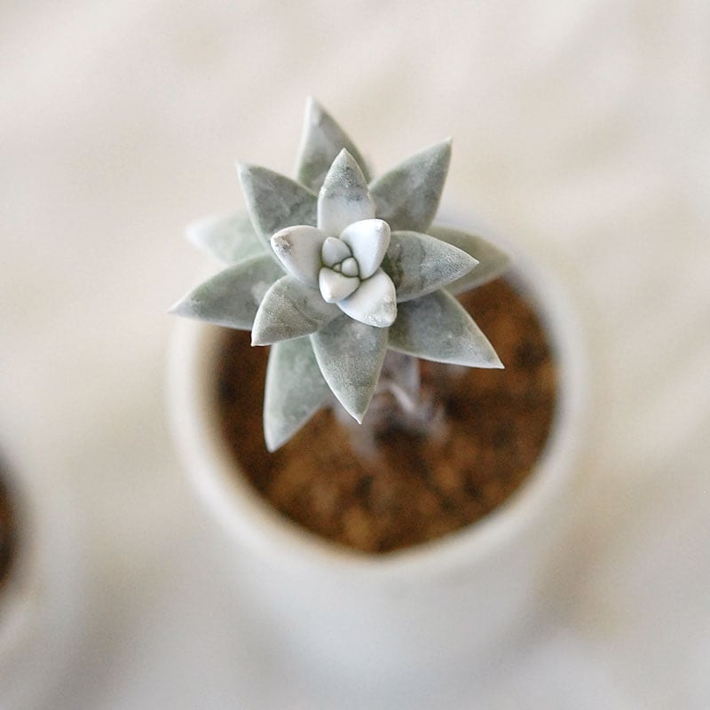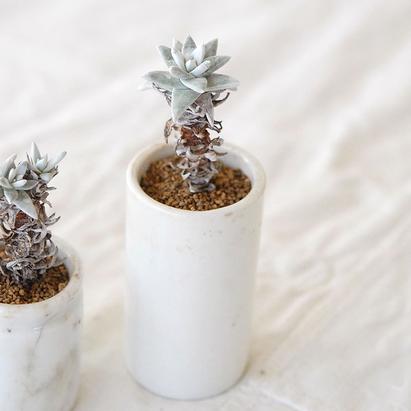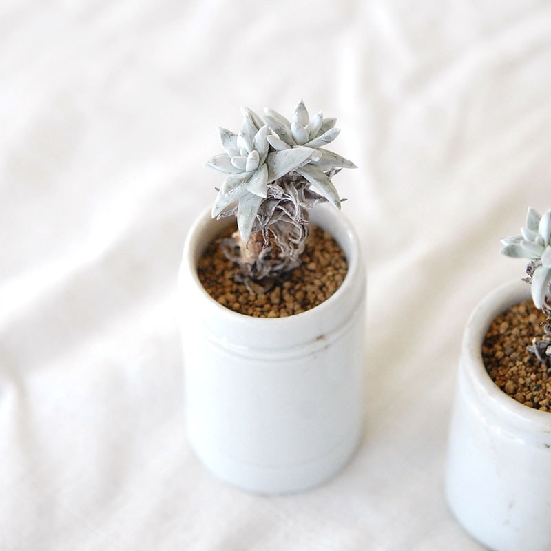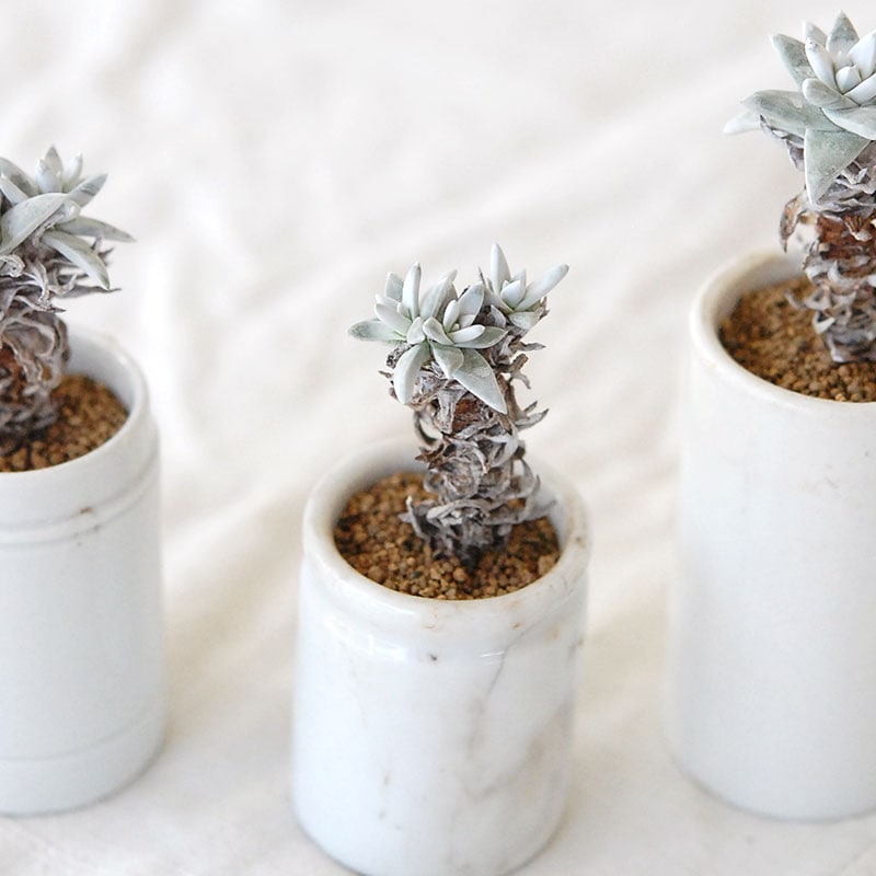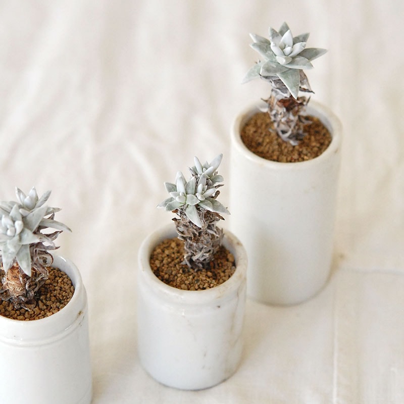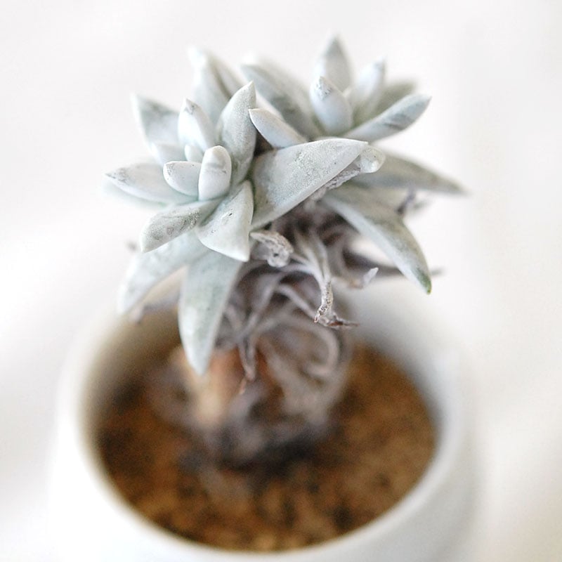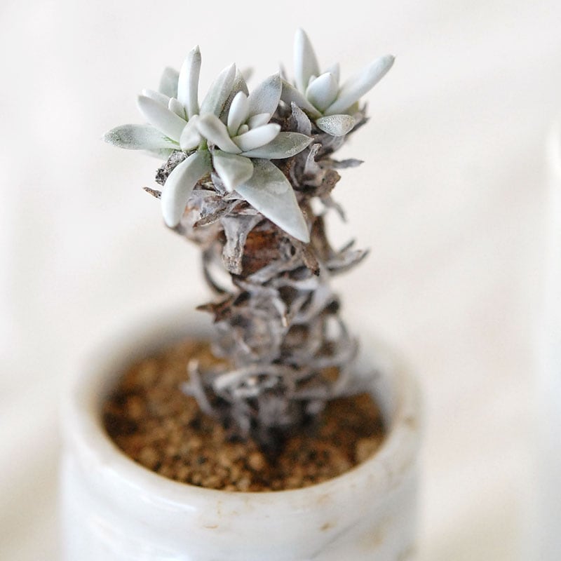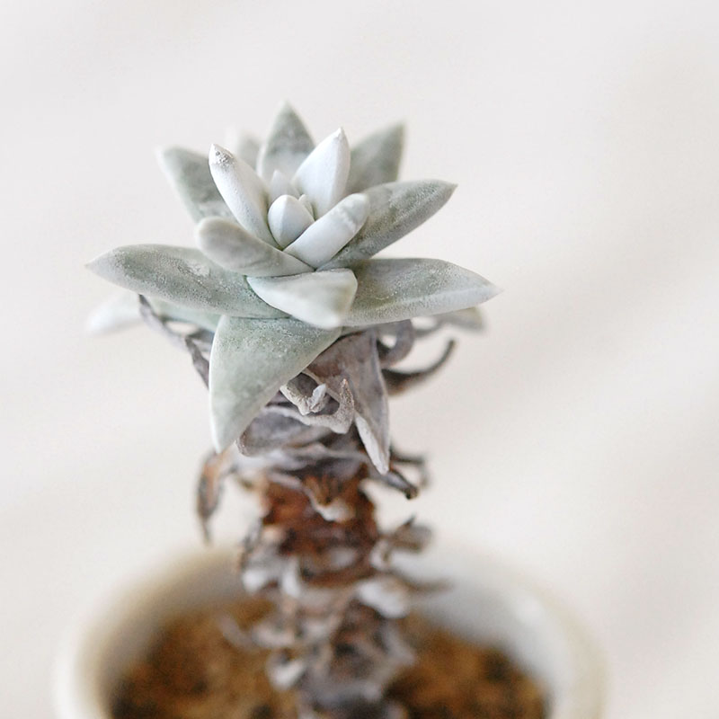 ダドレア属の小型種。真っ白な粉を纏った葉と枝についた成長の過程ででた枯葉のコントラストが美しい品種。