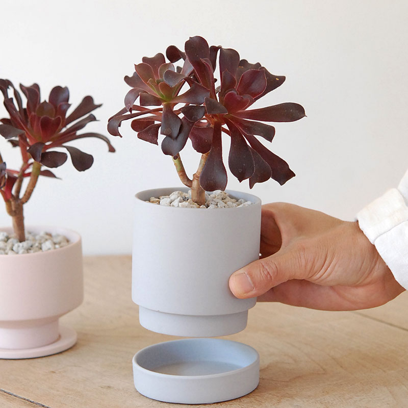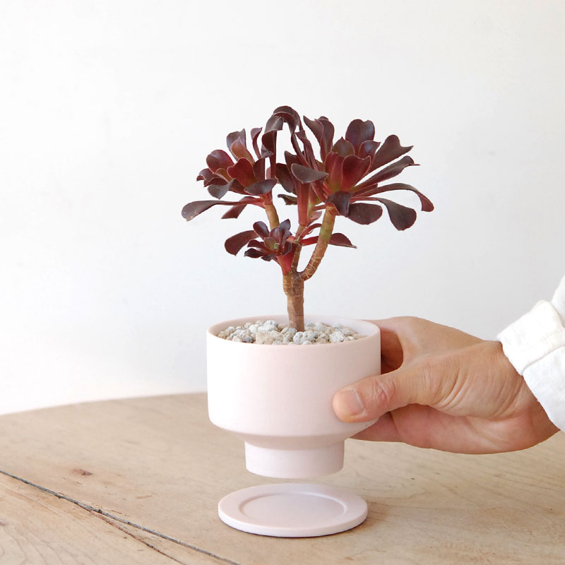 鉢底に穴があり、専用の受け皿がつきます。受け皿にあまり水がたまりませんので、お水をあげる際にはお気をつけくださいませ。