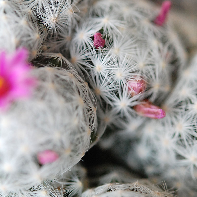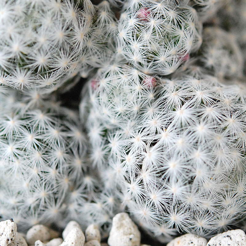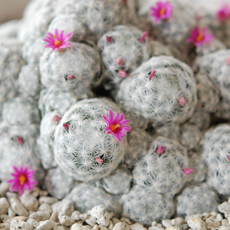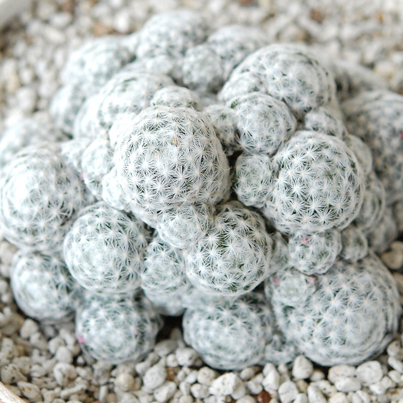 鞠のような丸く可愛いサボテンがいくつもついて群生していく品種です。 そこに冬に綺麗なピンク色の花を咲かせます!真っ白な棘はまるで雪の様に白くて綺麗ですよ!