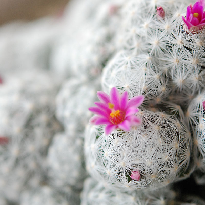 可愛いピンク色の花が咲く、白い巻棘のサボテン。