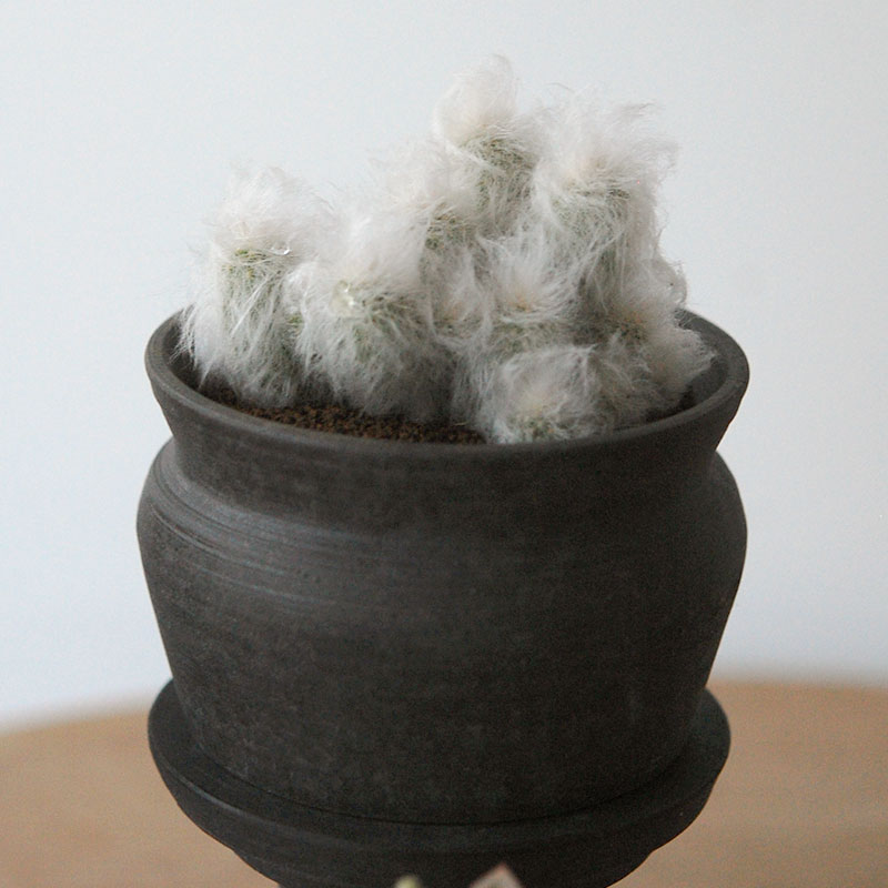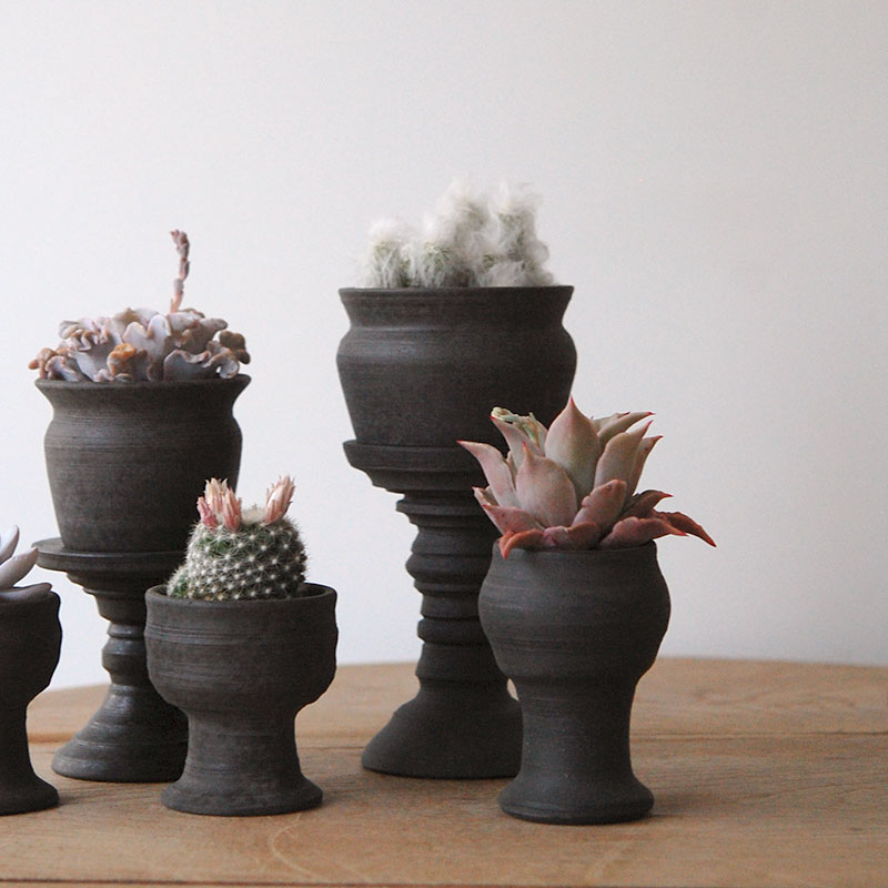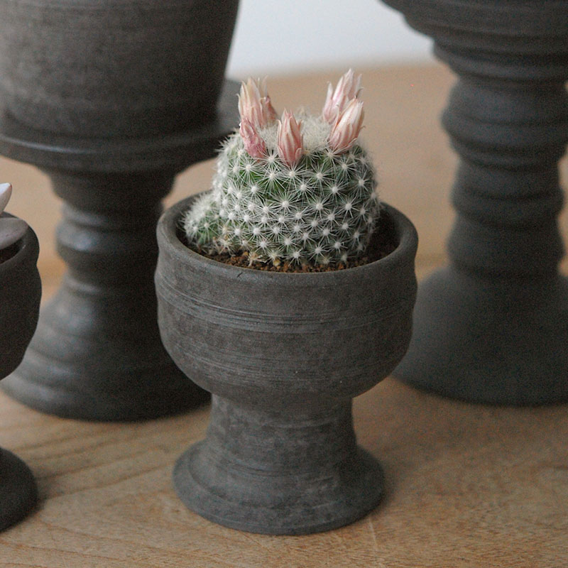 今回で3回目のご紹介でしょうか。気に入ったデザインのものをリクエストして作って頂きました。黒くても素朴さがあり、アンティークなどにも馴染むテイストが素敵で、存在感のあるデザイン。鉢底には穴がなく、横に水が抜ける穴がございます。